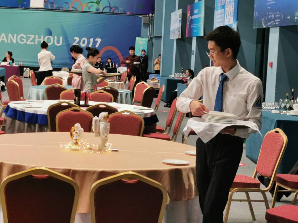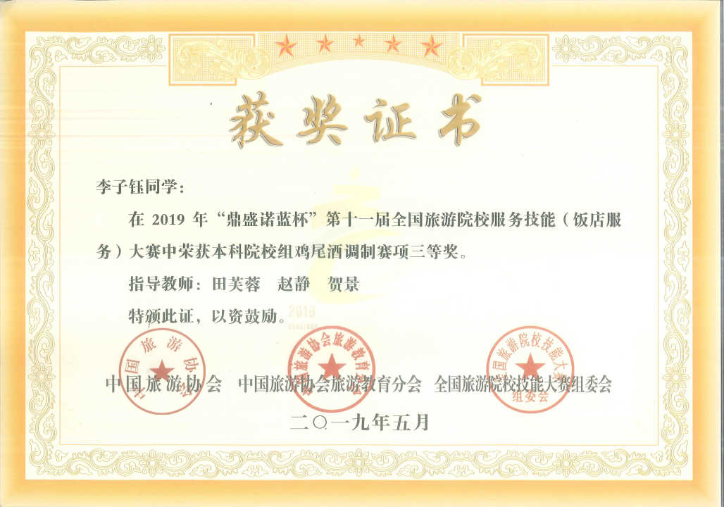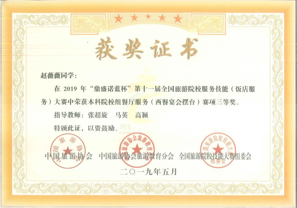 5月16日-19日, 2019年“鼎盛诺蓝杯”第十一届全国旅游院校服务技能(饭店服务)大赛在杭州举办,我校旅游学院陈渟渟、李子钰、章粤东、赵薇薇四名参赛选手均荣获本科院校组三等奖。陈渟渟同学荣获客房服务赛项三等奖,李子钰同学荣获鸡尾酒调制赛项三等奖,章粤东同学荣获餐厅服务(中餐宴会摆台)赛项三等奖,赵薇薇同学荣获餐厅服务(西餐宴会摆台)赛项三等奖。