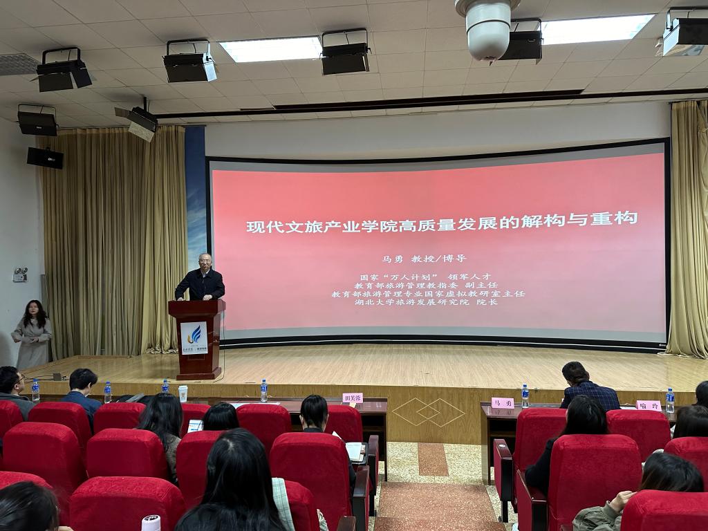为推进现代旅游餐饮产业学院建设,旅游学院3月19日上午,邀请全国知名旅游学者、中组部首批国家高层次人才“特支计划”领军人才、国家“高层次人才培养支持计划”教学名师、教育部高校旅游管理类教学指导委员会副主任、文旅部中国旅游研究院生态旅游研究基地主任、湖北大学旅游发展研究院院长马勇教授到校作学术讲座。讲座由旅游学院院长田芙蓉教授主持,旅游学院党政班子全体成员、师生代表共200余人参加讲座。