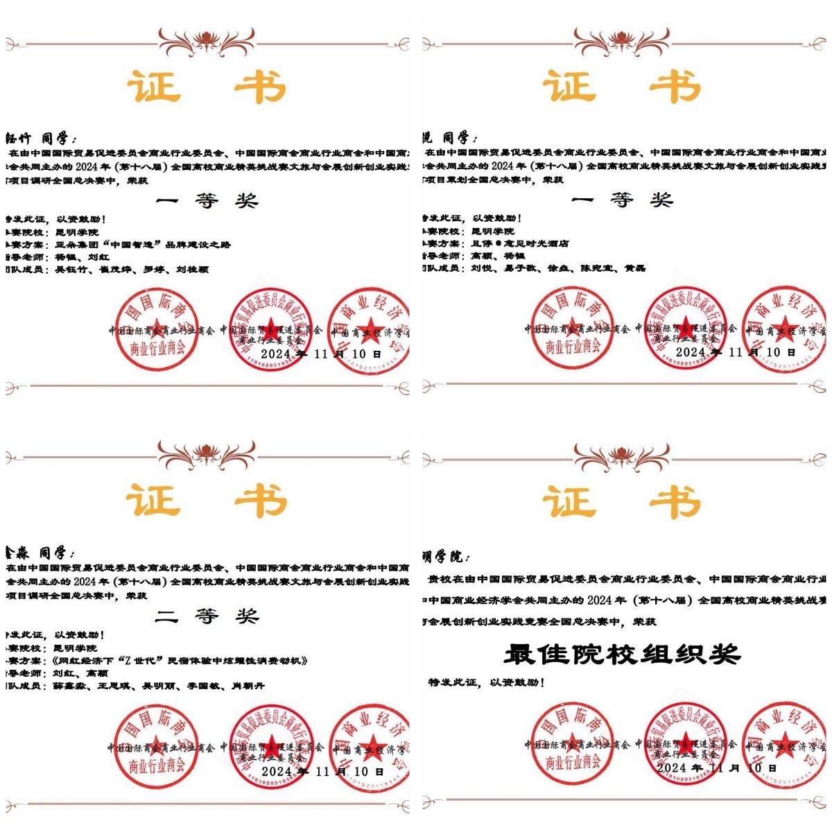 在2024年11月9日结束的2025年(新加坡)国际商务会展策划大赛中国地区选拔赛暨第十八届全国高校商业精英挑战赛文旅与会展创新创业实践竞赛全国总决赛中,旅游学院(现代旅游餐饮产业学院)3支队伍参加了酒店项目策划和调研比赛,由2023级旅游管理硕士研究生刘悦、吴钰竹分别带领的酒店管理专业本科生团队参赛作品《且停·愈见时光酒店》和《亚朵集团“中国智造”品牌建设之路》,均获得国家级一等奖;由2022级酒店管理专业本科生薛鑫淼带领团队的参赛作品《网红经济下“Z世代”民宿体验中炫耀性消费动机》,获得国家级二等奖。杨韫、高颖、刘红三位指导教师获得最佳指导教师奖,昆明学院获得最佳院校组织奖。