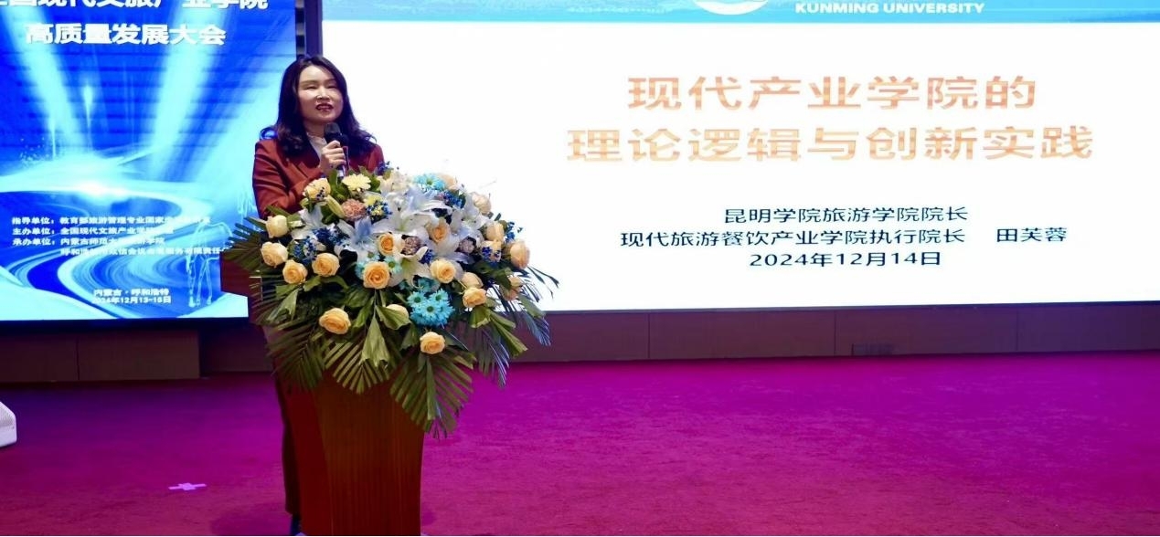 全国文旅产业学院高质量发展大会,是在教育部旅游管理专业虚拟教研室指导下,由首批国家级产业学院——内蒙古师范大学旅游学院主办。大会上,田芙蓉作题为“现代产业学院发展的理论逻辑与创新实践”的主旨演讲。演讲深入浅出地分析了现代产业学院理论逻辑,结合昆明学院现代旅游餐饮产业学院实际,分享了在教学改革、产教融合、校企合作等方面的创新做法和成功经验,提出对未来产业学院发展的展望。与会代表对田院长的演讲给予了高度评价,并就相关议题展开热烈讨论。最后,田芙蓉代表昆明学院对承办第二届大会做表态发言。