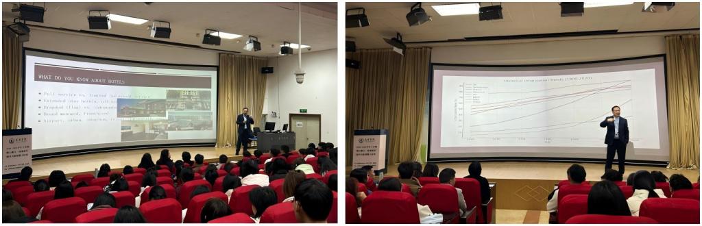 刘鹏教授结合康奈尔大学酒店管理学科研究成果及全球典型案例,系统阐释了数字经济背景下对酒店行业的深刻影响,特别聚焦酒店行业“轻资产战略”,深入探讨了品牌管理、地产管理、酒店管理合约等关键议题。刘鹏教授指出,轻资产战略已成为全球酒店行业主流发展方向,通过品牌输出、管理合同和特许经营等方式,酒店集团能够以较低成本实现快速扩张,同时降低自身财务风险,以万豪、希尔顿等国际酒店集团为例,解读了轻资产的核心优势。互动环节,学生就酒店管理方面专业知识及就业问题踊跃提问,刘鹏教授结合国内外前沿理论与自身调研数据逐一解答,深入浅出的分析与幽默风趣的语言,赢得现场阵阵掌声。讲座尾声,刘鹏教授鼓励在场师生要积极关注行业前沿动态,不断提升自身专业素养和实践能力。