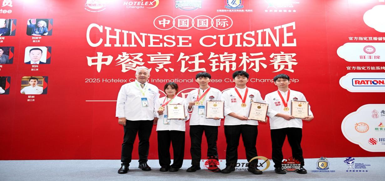 7 ⽉ 24日—26 日,在 2025Hotelex 中国国际中餐烹饪锦标赛中,我校旅游学院团队在孙志强副院⻓、王勇和杨升⽼师带领下获得佳绩。杨升、普⽴学、兰永军、周顺发获得团队⾦奖。岳李娜同学获得中式禽类主菜烹饪⾦奖、中式猪⾁主菜烹饪银奖,普⽴学同学获得中式点⼼制作银奖,杨⾦凤同学获得中式猪⾁主菜烹饪银奖、中国创新主菜烹饪银奖,兰永军同学获得中式禽类主菜烹饪铜奖,周顺发同学获得中式⽜⾁主菜烹饪铜奖。