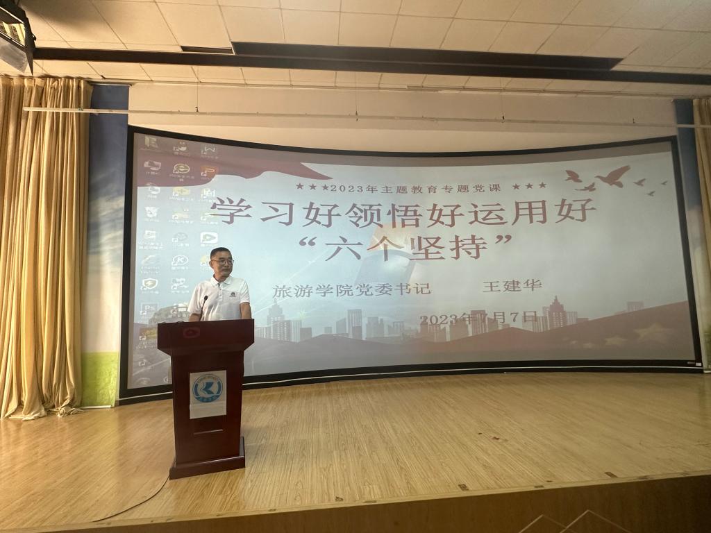 2023年7月7日,按照学校主题教育要求,旅游学院党委书记王建华以“坚持用习近平新时代中国特色社会主义思想的世界观方法论指导工作推动发展”为主题,为学院师生讲授专题党课。