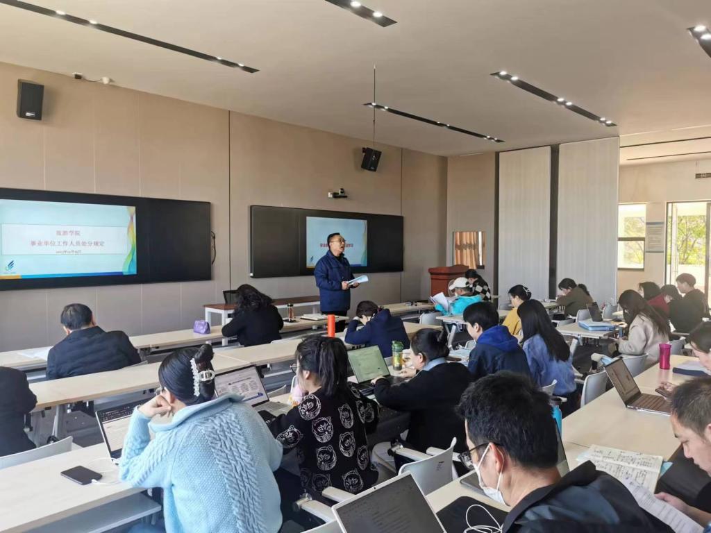 王建华解读《事业单位工作人员处分规定》,要求全体教职工认真学习,严格遵守。希望老师们认真学习领会学校关于师德师风工作的部署和要求,践行初心使命,从严修身律已,自觉筑牢师德防范,提升师德素养,自觉维护教师职业形象,为学院高质量发展贡献自己的力量。