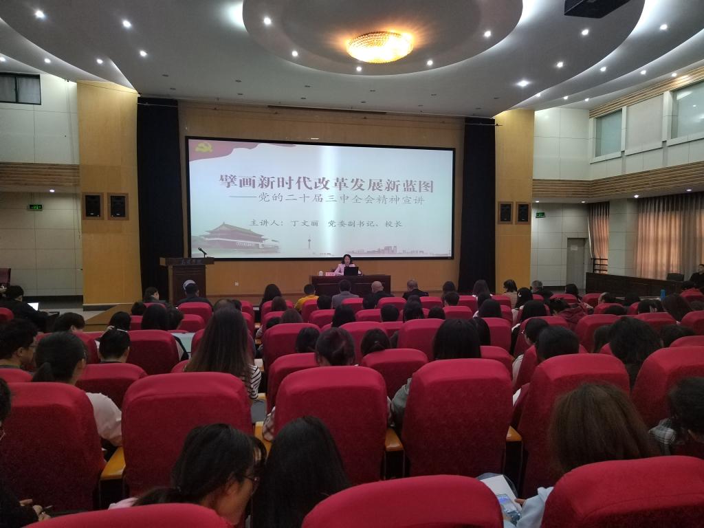 为做好党的二十届三中全会精神学习宣讲,按照学校党委要求,学校党委副书记、校长丁文丽于10月17日上午,在惟行楼1501,以“擘画新时代改革发展新蓝图”为主题,为联系的三个学院师生宣讲党的二十届三中全会精神。宣讲会由旅游学院党委书记先守福主持,学前与特殊教育学院、旅游学院、物理科学与技术学院200余名师生参加宣讲会。