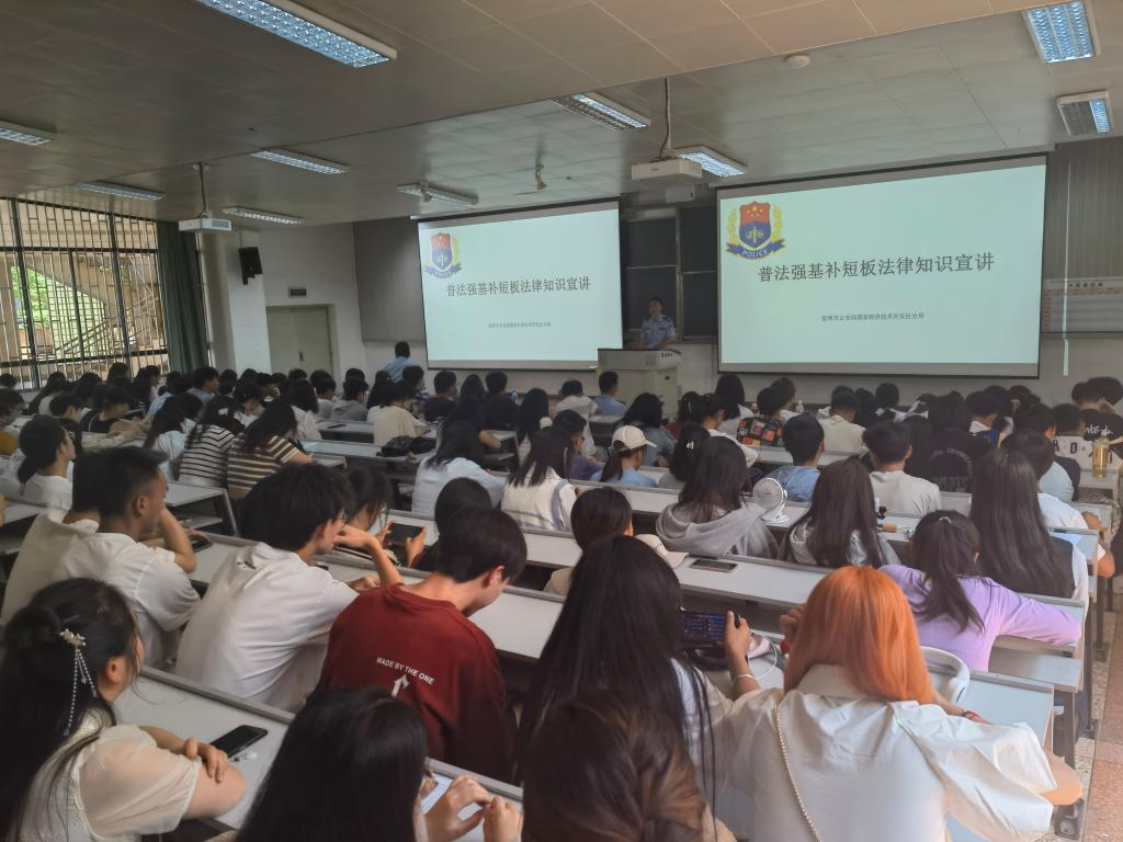 为深入推进普法强基补短板工作,进一步提高师生安全法制意识、反电信网络诈骗意识,2023年5月19日,昆明市公安局经开分局联合保卫处在学校博识楼1003阶梯教室举办普法强基补短板法律知识讲座。昆明市公安局经开分局昌宏路派出所副所长李学再、经开公安分局刑侦大队警官罗一航、昌宏路派出所警官符桐熒,学校保卫处副处长张智益、旅游学院党委副书记喻玲、旅游学院师生及各二级学院学生代表共300余名参加讲座。