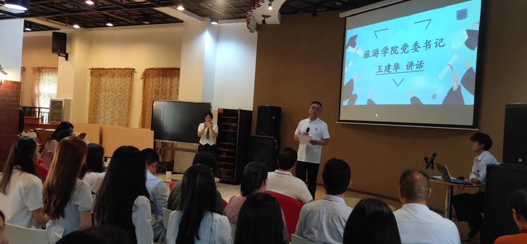 2023年6月25日下午,旅游学院在酒水实验室举办2023届毕业生座谈暨欢送会,为毕业季留下最美的告别。学院党政领导班子、党委委员、教研室和实验室主任、全体辅导员以及毕业班班主任、教师代表、毕业生代表共计100余人参加。党委副书记喻玲主持会议。