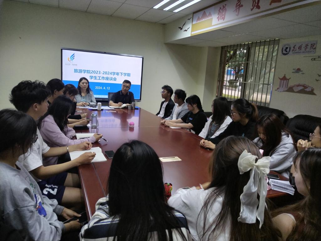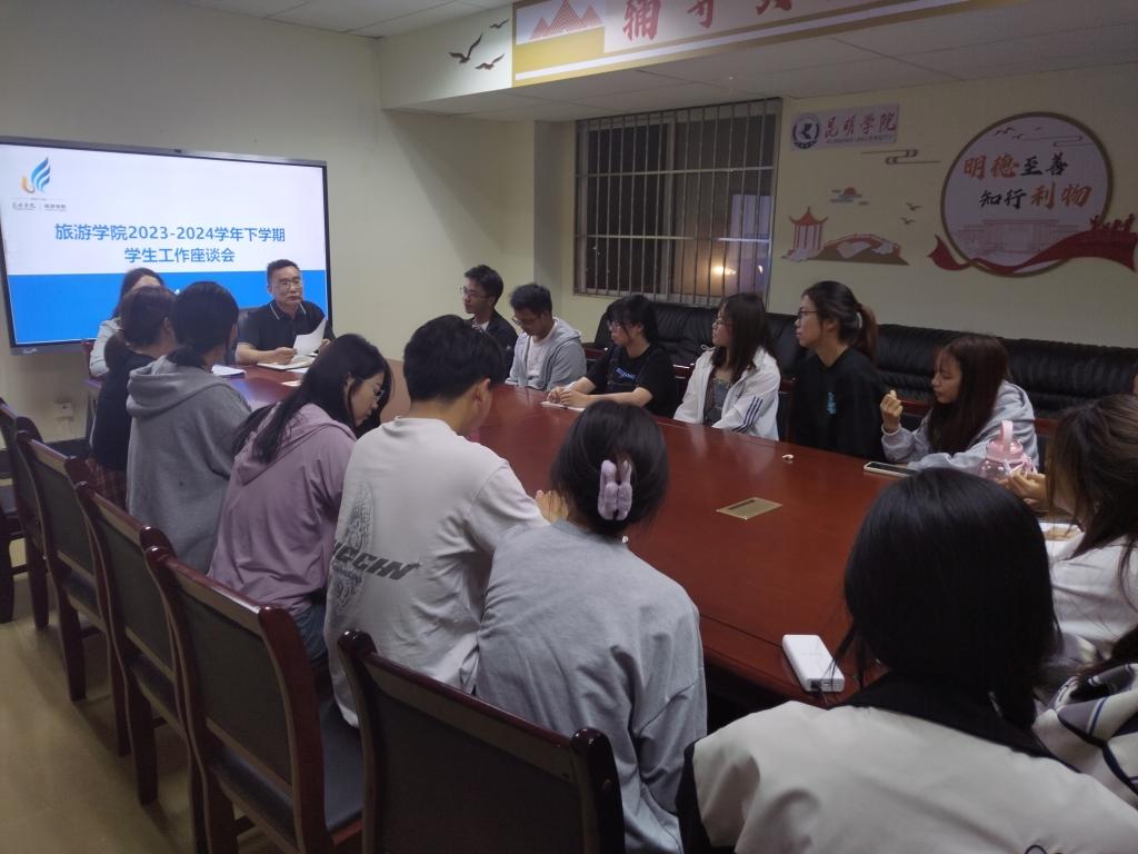 为贯彻落实“以学生为中心”的发展思想,倾听学生心声,回应学生关切,助力学生成长,4月12日晚,旅游学院在润泽苑辅导员交流空间,召开2023-2024学年下学期学生工作座谈会,党委书记王建华出席会议,各班班长、团支部书记30人参加会议。会议由党委副书记喻玲主持。