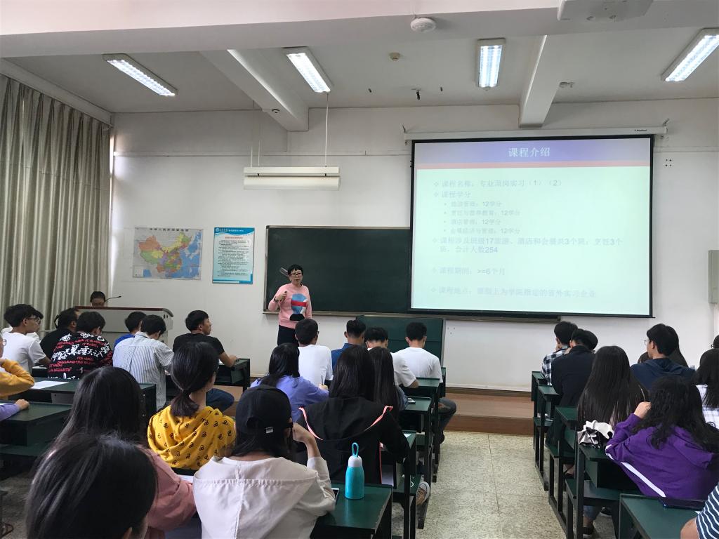 会上,李睿老师对实习管理规章制度、实习成绩评定和实习环节等方面做了详细解读。随后,李颖老师为同学们逐一详细介绍了本次实习备选单位,包括酒店、度假区、会展公司等25家实习单位的基本概况、招聘岗位、实习薪资待遇做了详细说明,并给同学们提供了宝贵的建议。在会议上实习工作小组工作人员动员同学们能够根据自己的专业和性格特点去选择适合自己的实习单位、工作岗位。最后上海迪斯尼乐园的应聘开启了本次专业顶岗实习的面试环节。