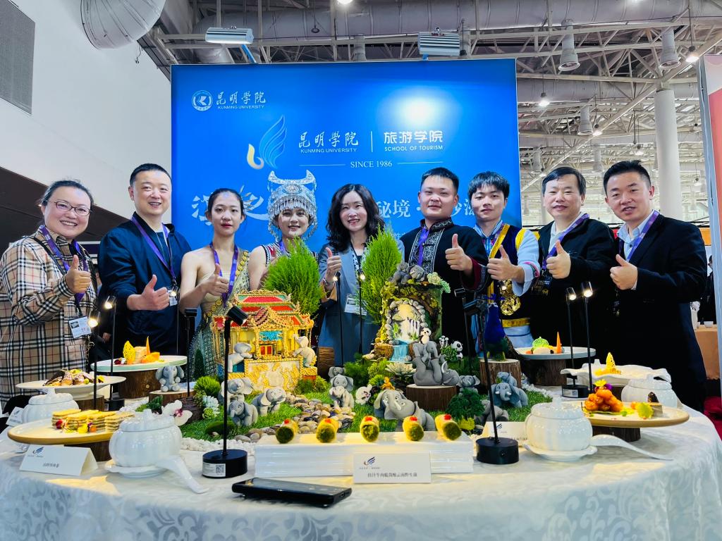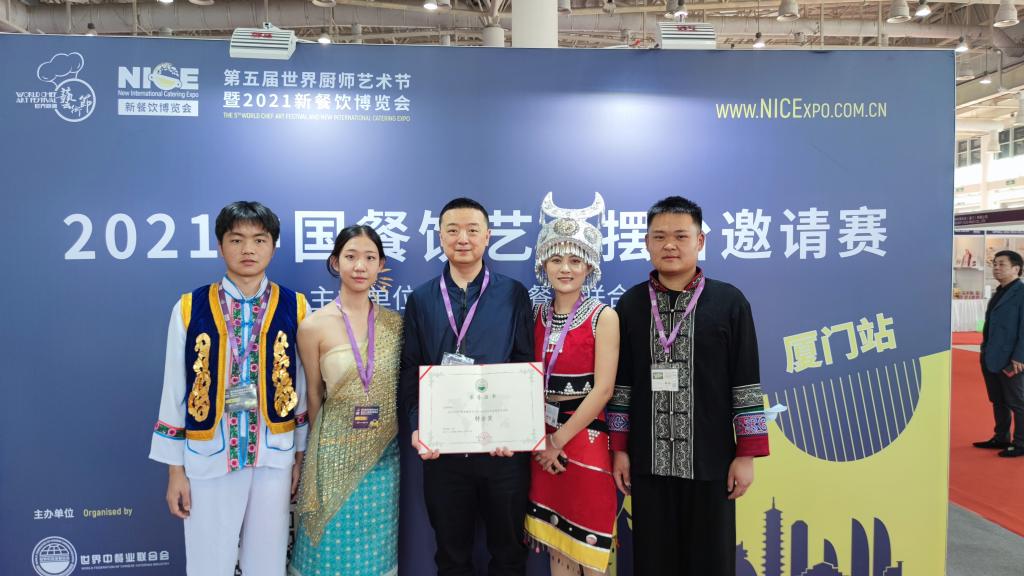 2021年12月12—13日,“第五届世界厨师艺术节暨2021新餐饮博览会”在厦门举办。昆明学院旅游学院田芙蓉院长、孙志强副院长亲自带队到厦门国际会展中心参加2021中国餐饮艺术摆台邀请赛。本次艺术摆台邀请赛特色鲜明,创意独特,为2021新餐饮博览会增添了靓丽风景。昆明学院旅游学院的《滇之韵》,以云南的食材和味道为基础,呈现生物和食物的多样性,通过不同的烹饪方法,把云南美味表现出来,充分展现了“人与自然和谐共生”的美好愿望。