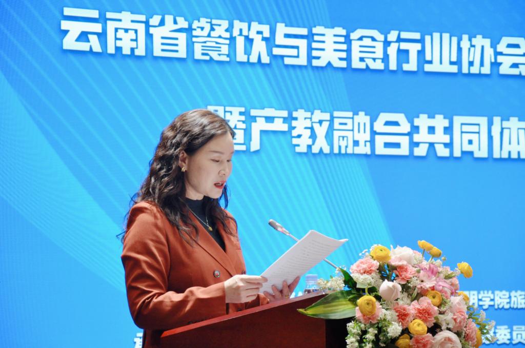 成立大会上,产教融合共同体负责人、教育专家委员会主任、昆明学院旅游学院院长田芙蓉为与会者介绍教育专家委员会的成立背景、宗旨、职责以及围绕职业教育自立自强设计的五项重点工作:提升有关职业学校餐饮类专业办学能力、加强“双师型”教师队伍建设、建设开放型区域产教融合实践中心、拓宽学生成长成才通道、创新国际交流与合作机制。