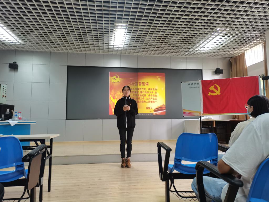 为进一步提高全体党员的荣誉感、责任感,切实发挥广大党员的先锋模范带头作用,9月18日,旅游学院党委在惟行楼模拟导游实验室,组织开展了“新党员入党宣誓,老党员重温入党誓词”主题党日活动。学院党委2名组织员、3位学生党支部书记、23名新接收的预备党员及其他党员同志参加了主题党日活动。