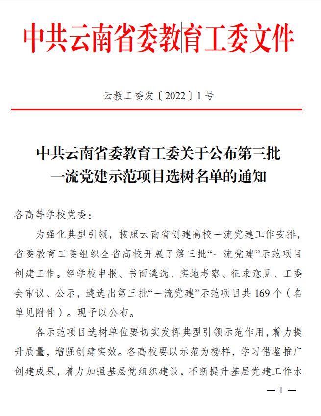 近日,云南省委教育工委发文,公布云南省委教育工委第三批一流党建示范项目选树名单,我院学生第三党支部被云南省委教育工委选树为第三批示范党支部。