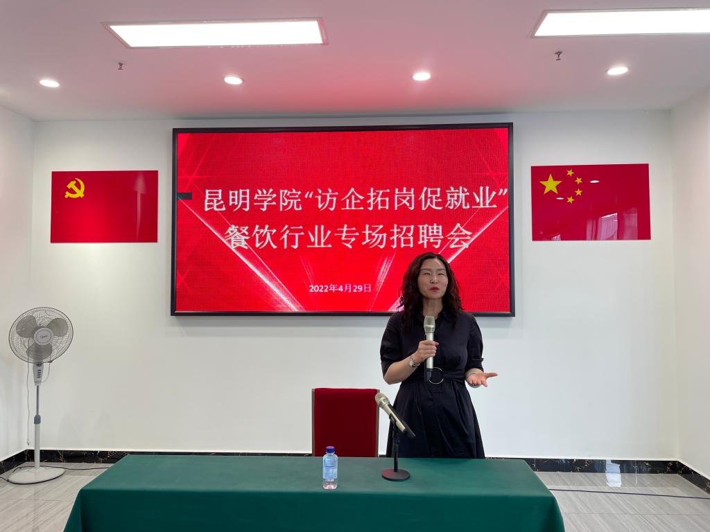 为进一步促进毕业生就业,将校领导“访企拓岗”行动落到实处,紧密联系毕业生需求,旅游学院通过云南省餐饮与美食协会(以下简称“餐美协会”),联系协会四家会员企业,于2022年4月29日在餐美协会举办昆明学院旅游学院“访企拓岗促就业”餐饮行业专场招聘会。云南省餐饮与美食行业协会监事会监事长刘欣、昆明学院旅游学院院长田芙蓉、云南省餐饮与美食行业协会副秘书长郗文娟等出席招聘会,共有四家企业人事代表、旅游学院负责就业工作的教师及部分毕业班班主任、旅游学院30余名2022届毕业生参加招聘会。