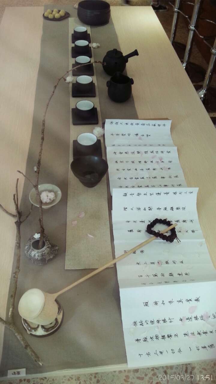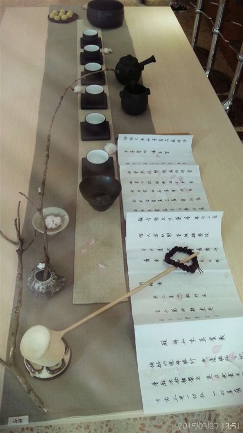 我们的老师认真地与同事们交流、示范有关茶道的方法和程序。整个过程显得那样的专注,动作也训练有素,一招一式既娴熟又稳重,动而不乱,静而养性。