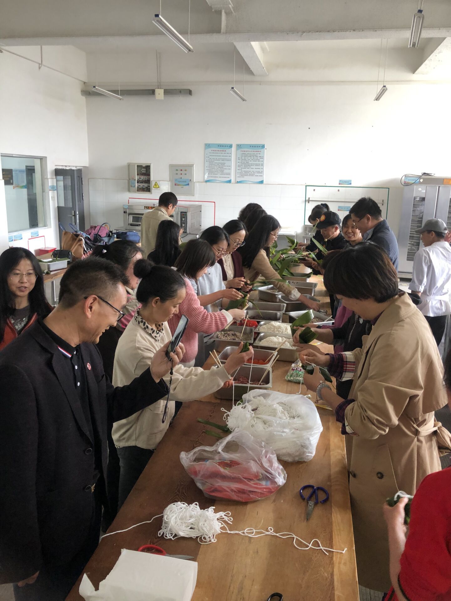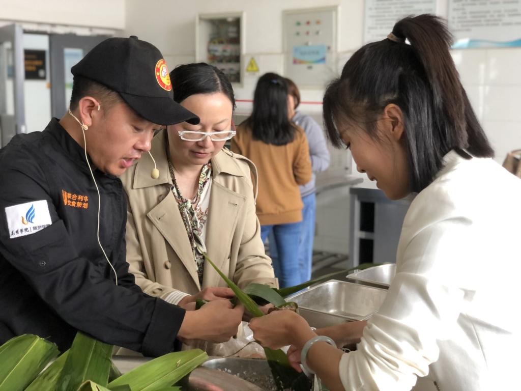 随后,旅游学院全体教师利用学院分工会提供的包粽子原料,自己动手,在刘福灿大师的讲授带领下,学习亲手包粽子。现场一片欢声笑语。