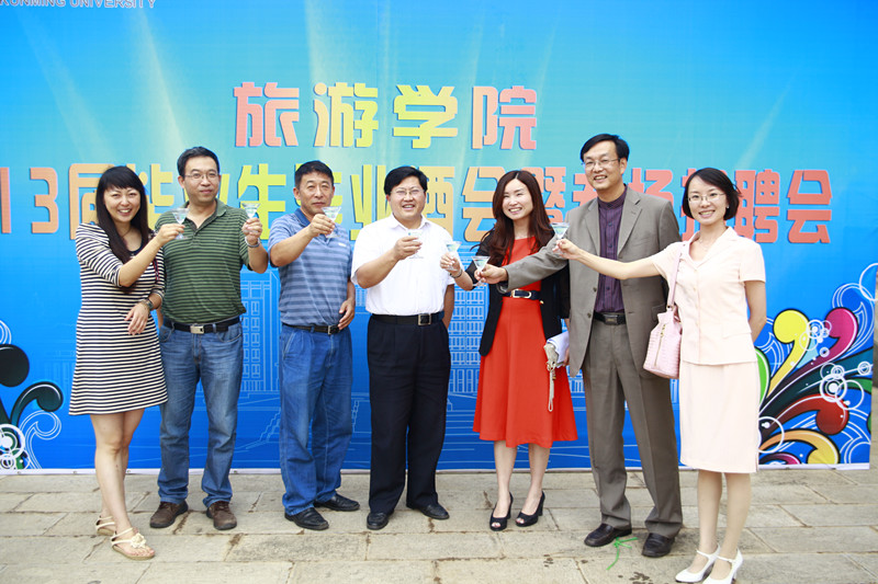 为欢送2013届毕业生,为毕业生就业搭建优质就业平台,推动毕业生就业工作,提高就业质量,6月25日上午,旅游学院在酒水实验室举行2013届毕业生毕业酒会暨专场招聘会。学校李翔副校长和十余家招聘单位领导参加了开幕仪式,学校孙勇副书记、罗明东副校长、招就处包兴处长等领导参加了酒会并同用人单位领导亲切交流,现场推荐我校毕业生。