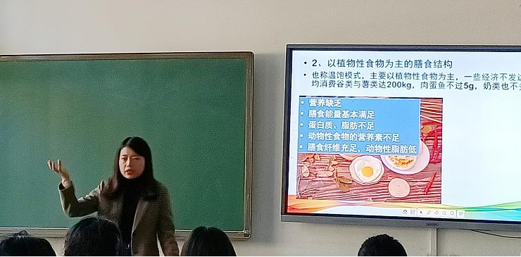 近年来,社会出现很多营养性疾病,如肥胖、糖尿病、高血压、高血脂、冠心病等。从人群结构看,全国超七成大学生有减肥经历,近五成学生减肥失败,美食诱惑、不喜欢运动是减肥失败的主要原因,超五成大学生没有制定减肥计划,超七成减肥失败者没有按照减肥计划进行。减肥属于以减少人体过度的脂肪、体重为目的的行为方式,需要科学指导。科学减肥要遵循“稳扎稳打、营养不减”的总原则,通过运动和饮食等方式,纠正造成肥胖不合理的饮食习惯和作息时间以及少量的运动。伍欣老师为同学们介绍了科学的膳食类型:动植物食物平衡的膳食结构、以植物性食物为主的膳食结构、以动物性食物为主的膳食结构、地中海膳食结构。